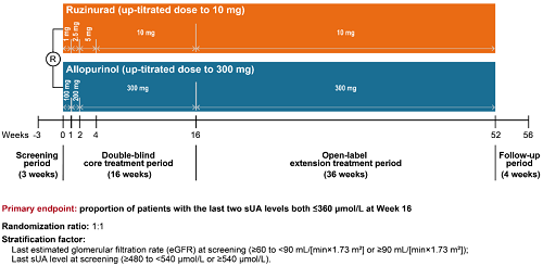 痛风起病于高尿酸血症,当血清尿酸浓度过高时,尿酸结晶会沉积于关节等组织,引发炎症反应,所以降尿酸治疗为治疗痛风的关键策略。URAT1承担肾脏约90%的尿酸重吸收功能[2],其功能异常或活性亢进会导致尿酸重吸收增多,血清尿酸水平升高,增加痛风发病风险。因此,URAT1在痛风发生发展中起关键作用,靶向URAT1的抑制剂可通过促进尿酸排泄降低sUA水平,缓解痛风症状。鲁兹诺雷钠片是z6尊龙官方网站医药自主研发的一种高选择性URAT1抑制剂,在前期的一期、二期研究中,鲁兹诺雷钠片耐受性良好,并显示出显著降低高尿酸血症患者sUA的效果[3]。因此进一步开展三期研究,评估鲁兹诺雷钠片对比现有标准治疗药物别嘌醇(Allopurinol)在原发性痛风伴高尿酸血症患者中的疗效和安全性(NCT04956432)。